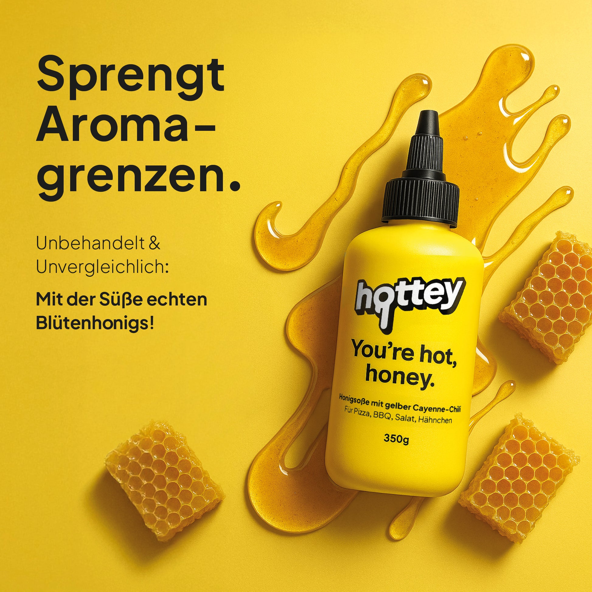 Hottey sprengt Aromagrenzen und sorgt für den Süße-Schärfe-Kick auf knuspriger Pizza, zu saftigem Hähnchen, feurigen Ribs oder als Dressing im knackigen Salat. Jetzt Hot Honey kaufen!